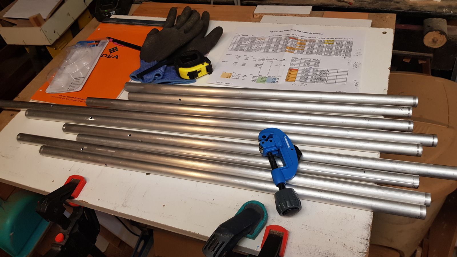 Le calcul des longueurs des tubes, la découpe et les tests de fréquence obtenue m'occupent une bonne soirée. Il faut ensuite les percer ébavurer, et protéger les trous pour que le fil de suspension ne s'y use pas. J'utilise pour cela des tubes de Chupa-Chups (et je jette les boules ... si vous les voulez, prévenez-moi ! :-)))