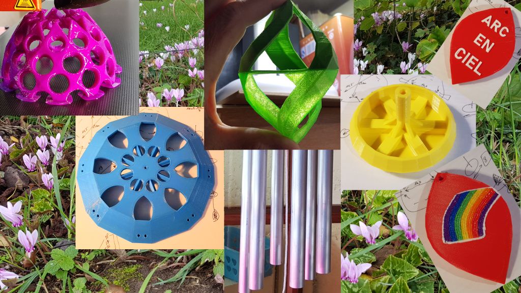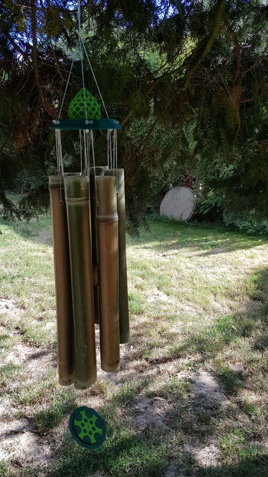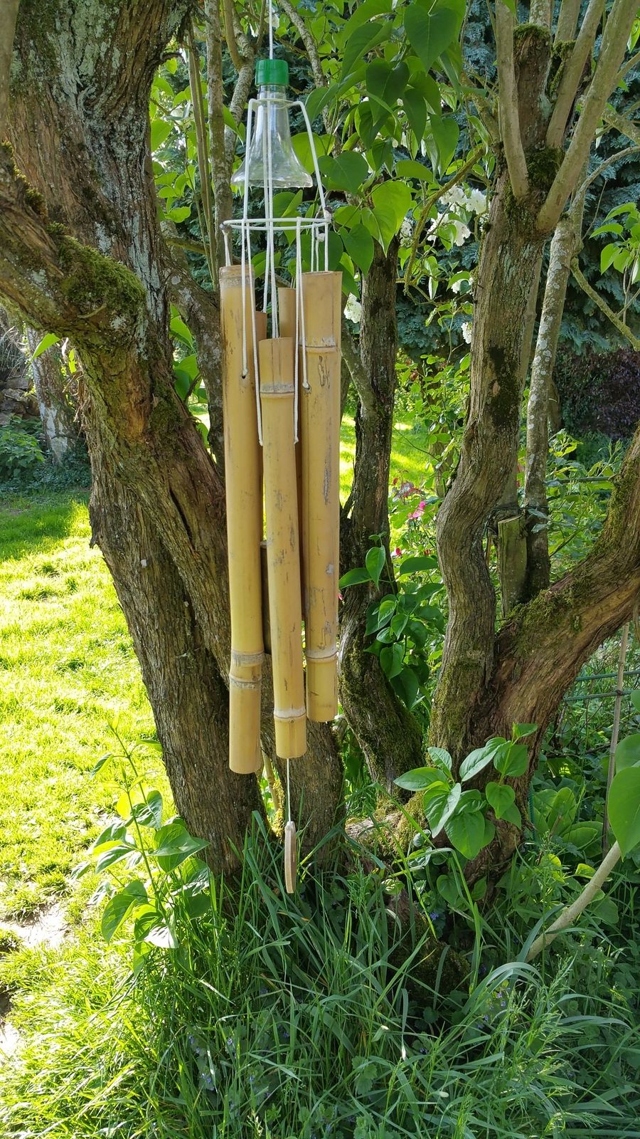 Quelques tubes de bambous aux dimensions recopiées sur un carillon classique ont accompagné les bruits d'oiseaux dans mon jardin pendant quelques années, puis les intempéries ont eu raison des ficelles et du bois. J'ai tenté de refaire le montage, mais il me fallait quelque chose de plus précis, plus agissant et plus pérenne...