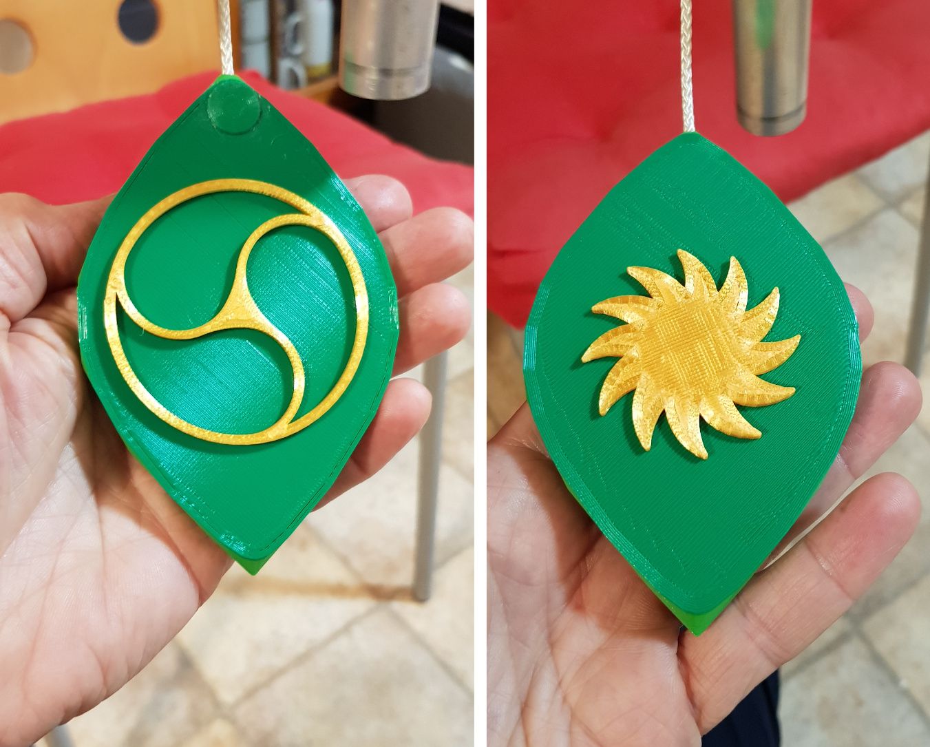 sur le balancier, un petit Triskel horizontal au recto pour fixer, et un petit Soleil au verso.