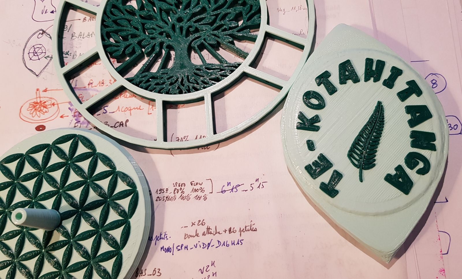 Sur une base d'Arbre, Fleur et Graine de Vie, vert pâle et vert sapin,